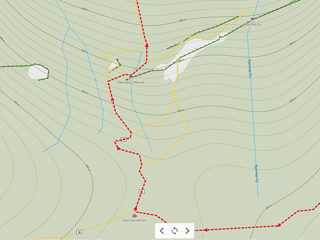 От Куртлеровского бука продолжаем идти прямо никуда не сворачивая. Тропа появится буквально через 50 - 100 м. Но если вы даже её не увидели, то не отчаивайтесь и не тратьте время на её поиски. Прямо перед вами находится дорога, мимо которой вы не пройдёте. Поворачиваете вправо и двигаетесь к проходу Ялпах. Не пропустите срезку, иначе дадите лишний крюк. Проход найти достаточно просто, он находится между двух скал. Это хорошо видно на карте.