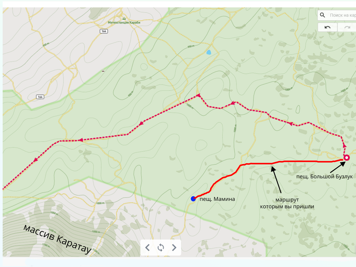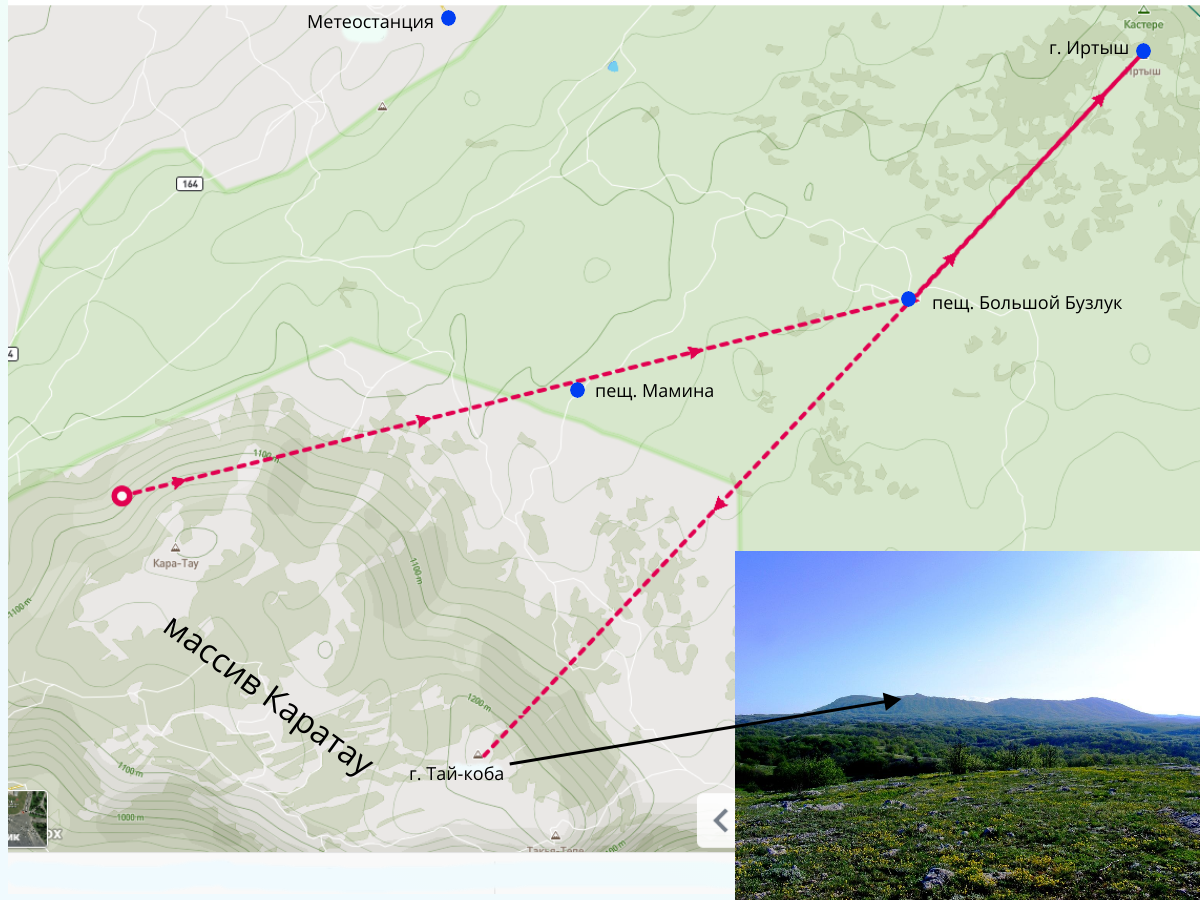 Если встать на Иртыш и идти на г. Тай-Коба, то мимо Большого Бузлука не пройдёте (см. карту). А если от Большого Бузлука выбрать направление на середину склона западной оконечности массива Каратау, то попадёте как раз к пещ. Мамина.